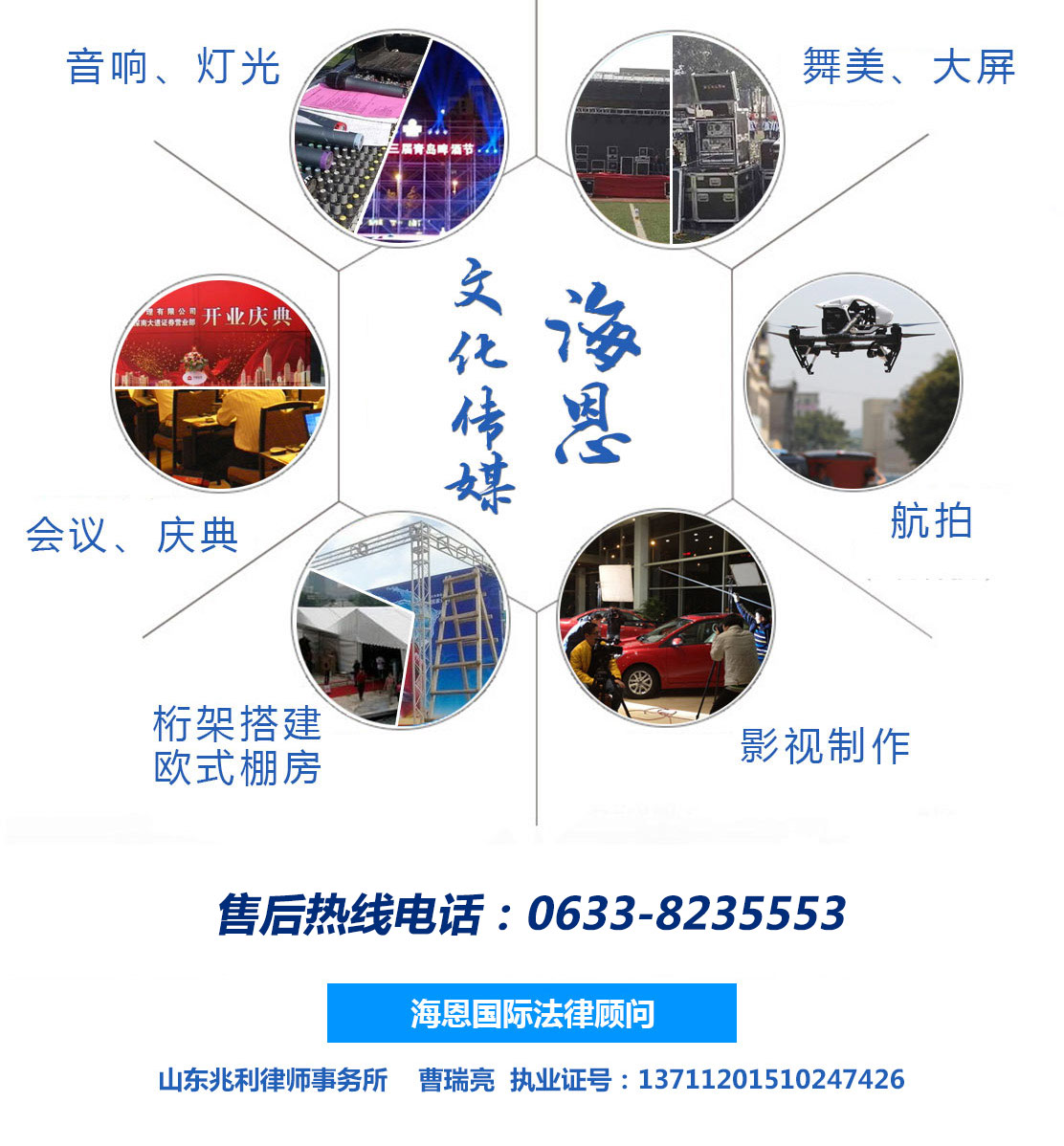 日照海恩國際展覽股份有限公司主要經營:為文化藝術交流提供服務,攝影攝像服務,廣告圖文設計,舞臺設計,文化藝術交流策劃,舞臺藝術造型策劃,企業營銷策劃,商務信息咨詢,會議服務,展覽展示服務,禮儀慶典服務,廣告設計制作等產品。公司尊崇“踏實、拼搏、責任”的企業精神,并以誠信、共贏、經營理念,創造良好的企業環境,以全新的管理模式,完善的技術,周到的服務,我們始終堅...
